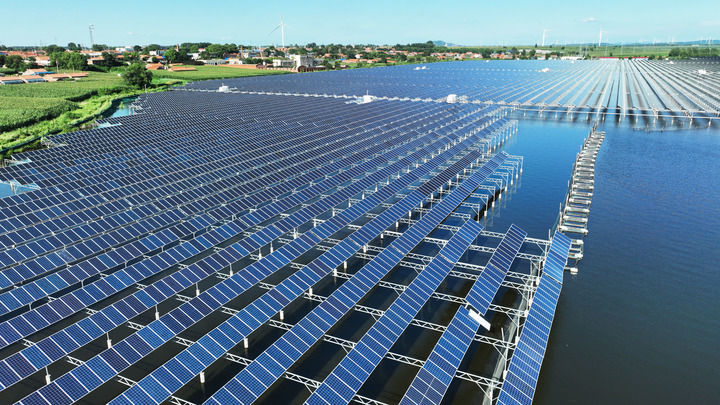 2025年7月30日在遼寧省鐵嶺市鐵嶺縣大青水庫(kù)拍攝的光伏發(fā)電板(無(wú)人機(jī)照片)。新華社記者 楊青 攝