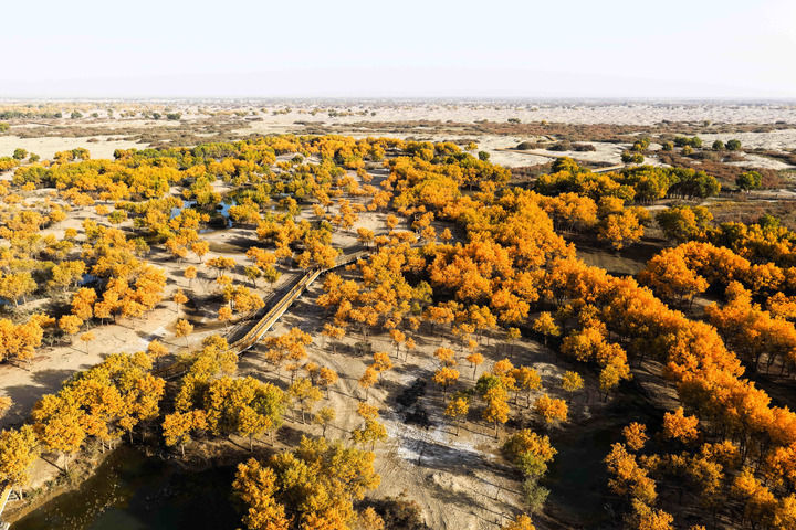 這是2025年10月19日拍攝的新疆和田地區(qū)洛浦縣洛濱胡楊林景區(qū)風(fēng)光(無(wú)人機(jī)照片)。新華社記者 辛悅衛(wèi) 攝